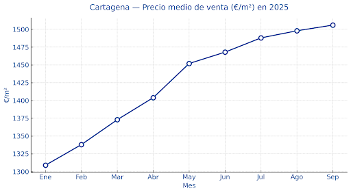 Recordemos que a fecha de septiembre de 2025 (últimos datos disponibles), el valor medio por metro cuadrado en la ciudad de Cartagena es de 1.506 euros.